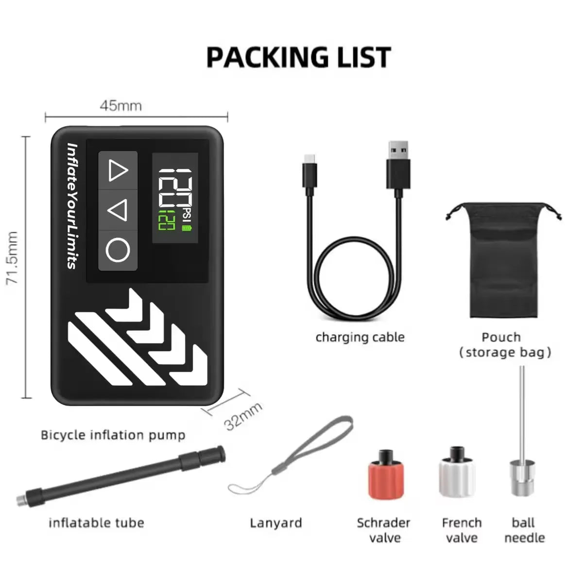 Mini-pompe électrique vélo 120 PSI avec manomètre digital – USB-C – 108 g